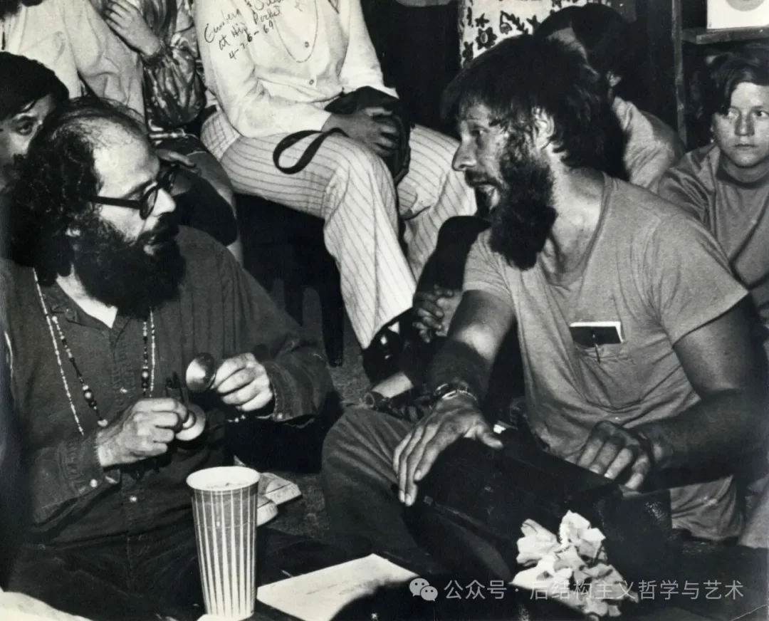 图7. 金斯伯格和奥洛夫斯基合照,1969 年。美国 “垮掉禅” 或 “禅疯子” 生活的主要内容之一,就是流浪、酒精、毒品和滥交。以此角度便能理解为什么库斯比特要说:金斯伯格 “裸体站在日本海前就变成了和尚” 吗?“人们对于亚洲 ‘理论’ 与宗教伦理——往往一知半解 (比如金斯伯格的《嚎叫》确实是在遵循佛教 ‘正语’ 的戒律吗?) 却随意用于各类艺术创作,并赋予 ‘智性’ 合法外衣和 ‘人性化’ 光环,借此来扩彰那些原本有限的形制和物质意义。” 全文见范炳煇译《库斯比特:心系亚洲——美国当代艺术理论分析与反思》。