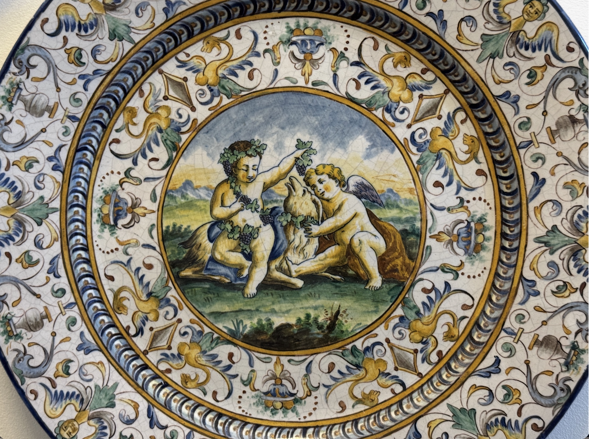 图 9. 《少年耶稣与少年洗礼者约翰》,欧洲常见陶瓷装饰挂盘,马约莉卡烧造,18 世纪末,直径 50 公分,The Outlandish Collection, USA