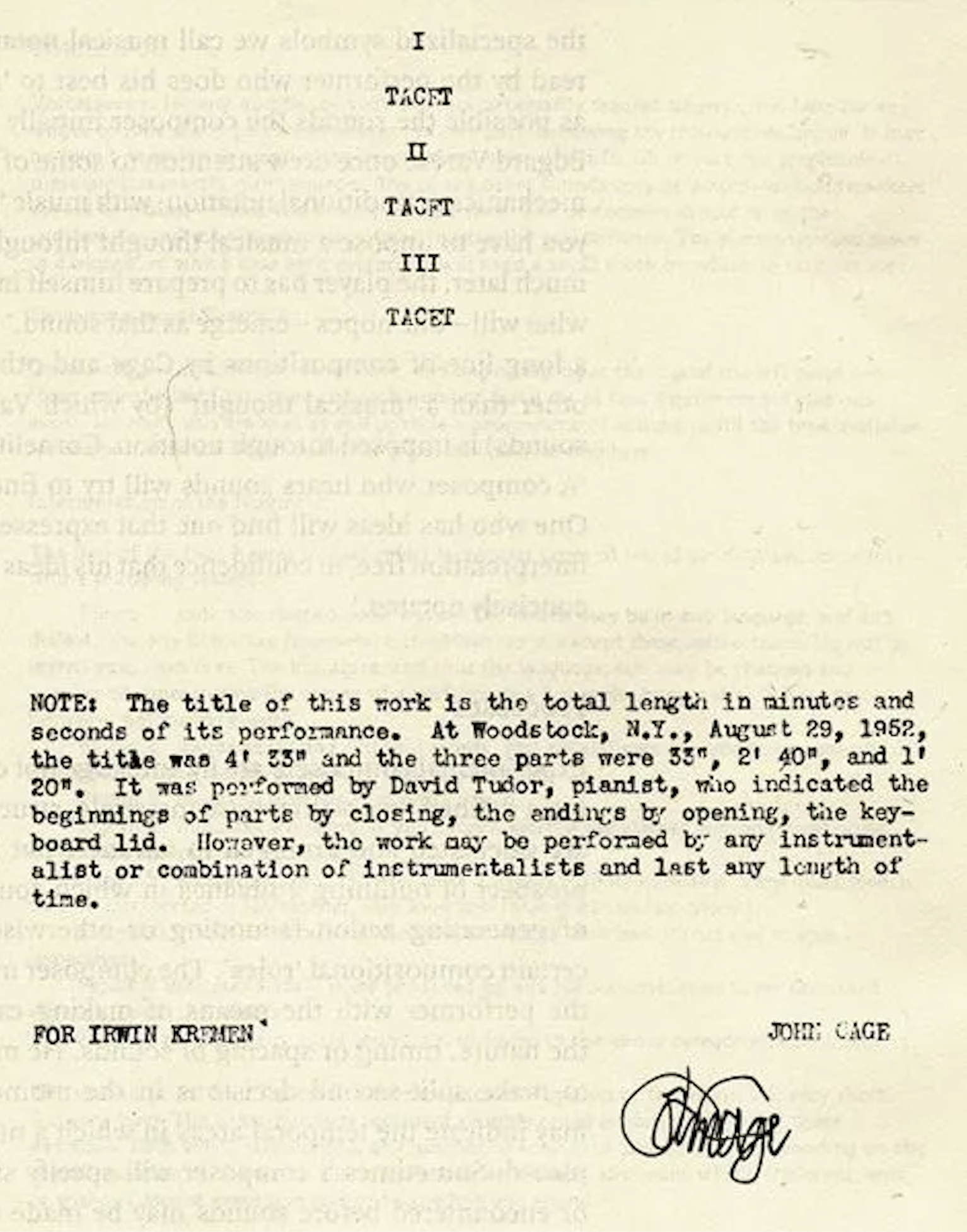凯奇《4 分 33 秒》原谱已遗失,虽然现存数种版本,但这些不同版本的曲谱,与凯奇自己的解说,同样扑朔迷离。1988年,凯奇在哈佛大学讲座问答中,描述了创作《4分33秒》的过程: