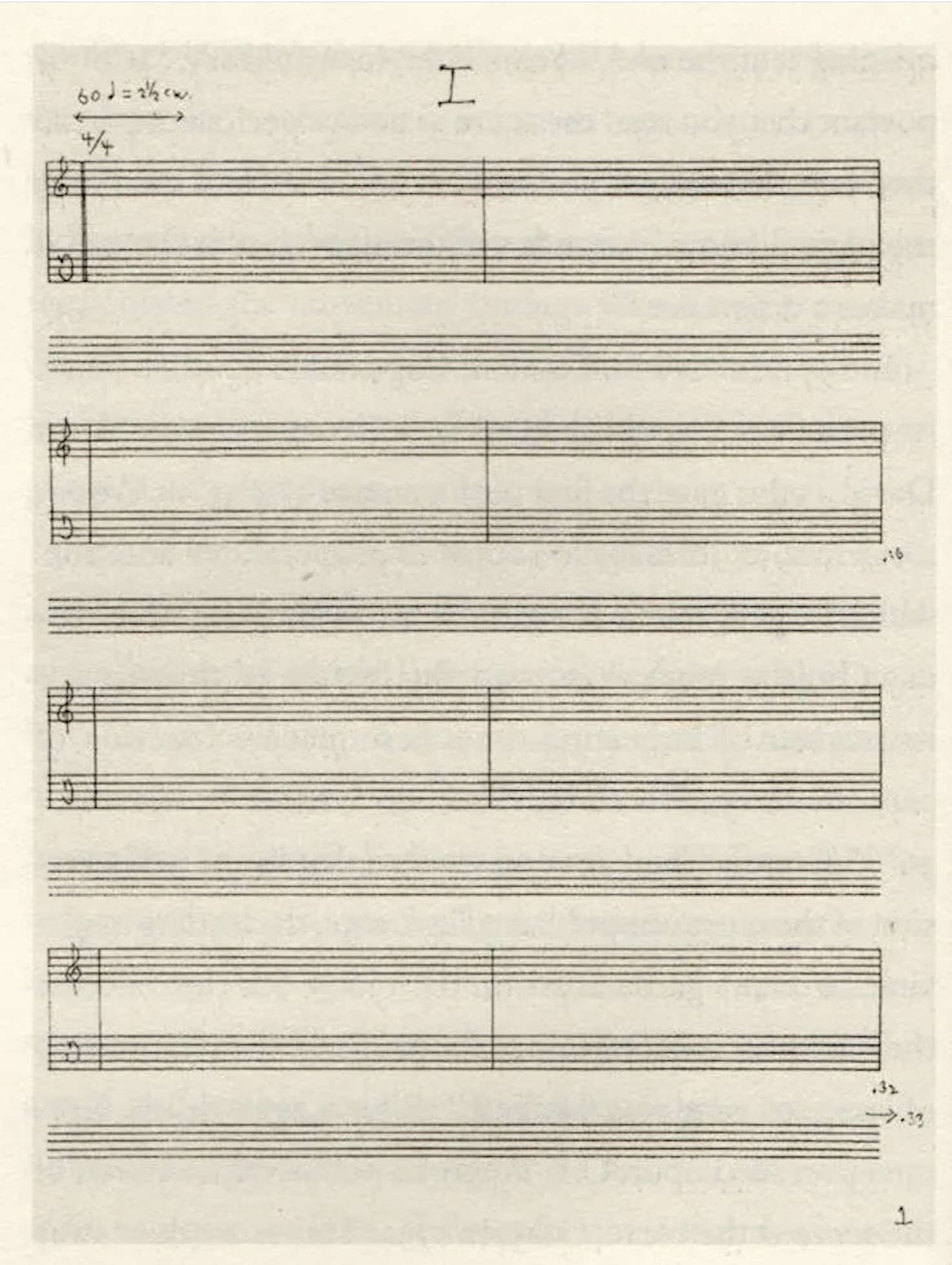 凯奇:我一段一段写出来,就像创作《变化的音乐》一样。把所有音符时值加起来,就知道总时长是多少了。创作过程就像谱写乐曲,只是没有声音但有时值。我先洗牌,每张牌上标着时值,然后再发牌,借助塔罗牌来确定如何使用它们。牌阵很复杂,是个大布局。