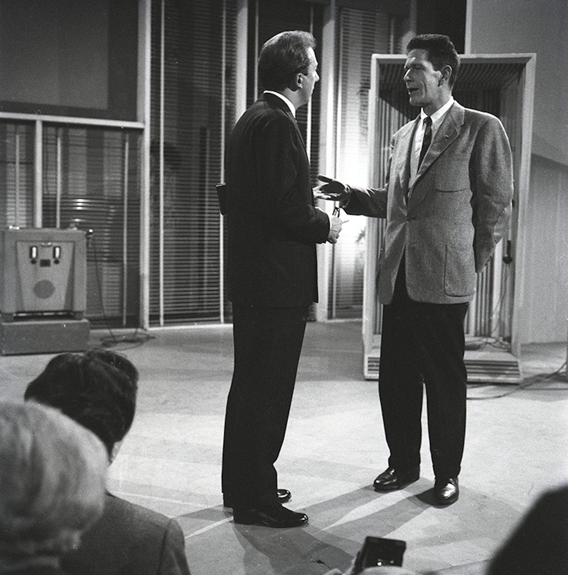 图 17. 凯奇和主持人邦吉奥诺 (Mike Bongiorno) 在米兰 “Lascia o Raddoppia?” 节目工作室,1959 年一月二十九日。